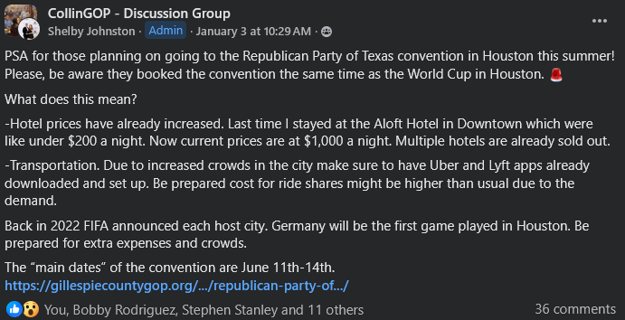 A post on the Collin GOP Facebook Page last week notified Republican Party of Texas (RPT) Convention attendees to prepare for extra expenses and crowds as the convention was booked at the same time as the World Cup.