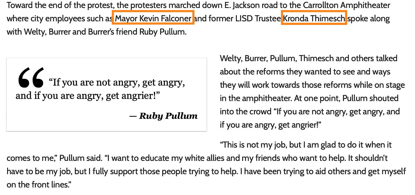Denton County Commissioner Kevin Falconer also attended. Falconer’s most notable accomplishment was helping headline a BLM rally along with then-LISD Trustee (now one-term state representative) Kronda Thimesch.