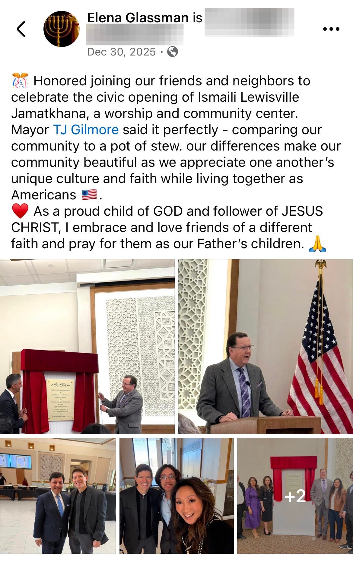 Elena Glassman, Field Representative for Congressman Ronny Jackson made a post praising the Ismaili Lewisville Jamatkhana’s opening (their TDLR is seen here).