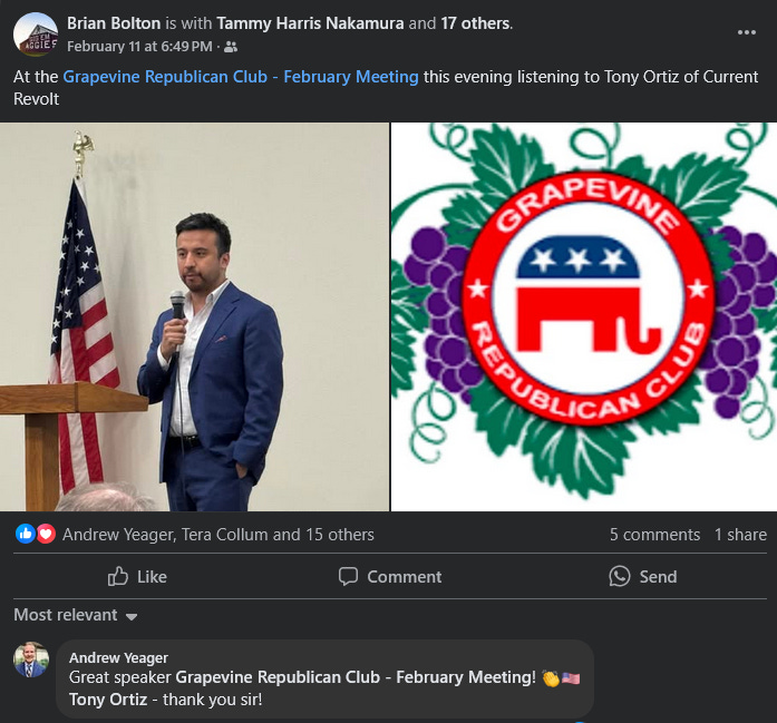 Current Revolt publisher, Tony Ortiz, recently spoke at the Grapevine Republican club.