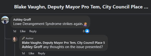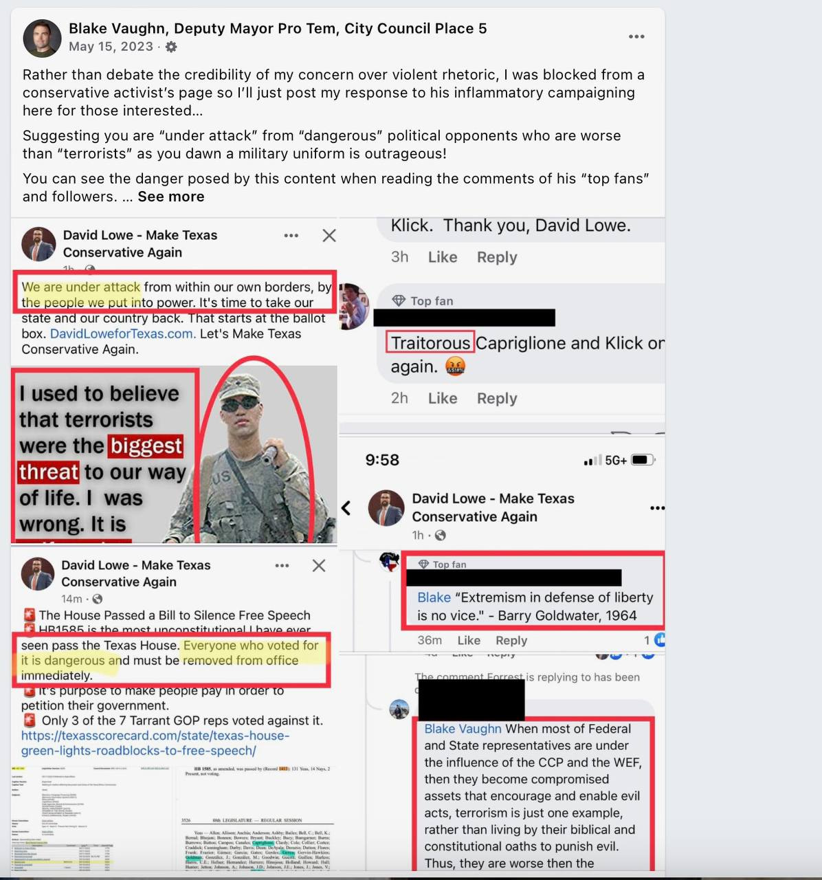 Blake Vaughn, North Richland Hills Deputy Mayor Pro Tem, has an odd obsession with Rep. David Lowe, where he seemingly complains on Facebook almost every day about him.