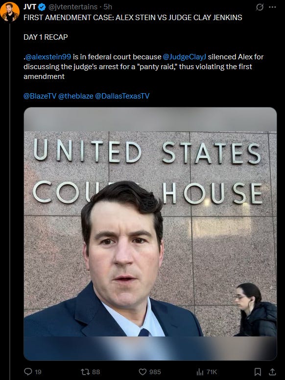 Local Dallas hero and legend Alex Stein took Dallas Judge Clay Jenkins to federal court today over, what Stein alleges, is a violation of his first ammendment rights.
