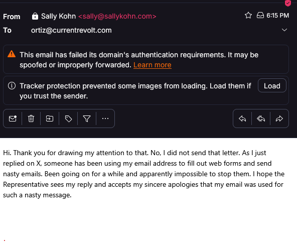 We reached out to Sally Kohn for comment and she stated that she did not send that email. Kohn further stated that recently “someone” has been using her email address to do this sort of thing.