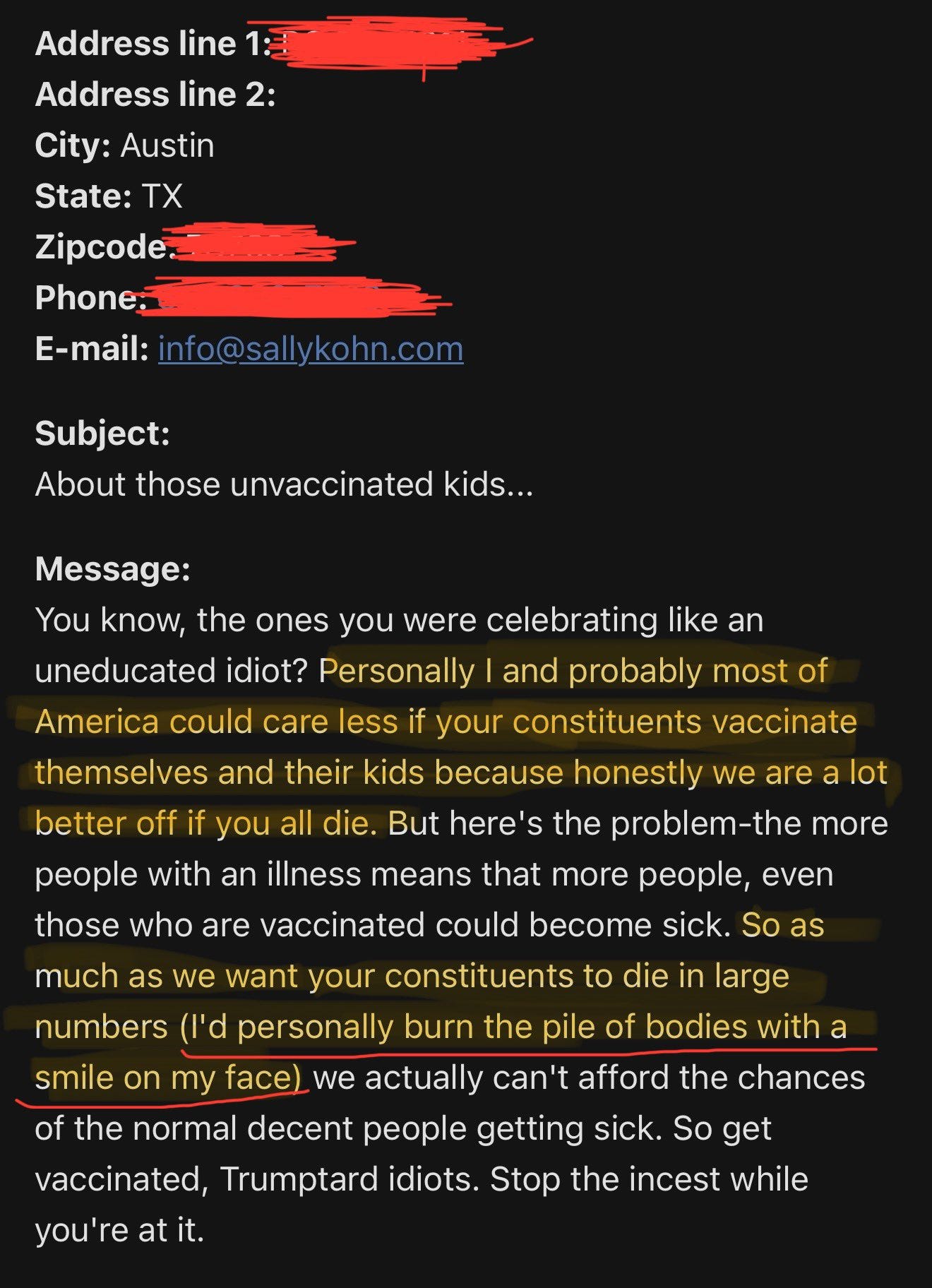 In the email, it wishes the death on Rep. Schatzline’s constituents and Kohn states that she would personally like to burn their dead bodies.