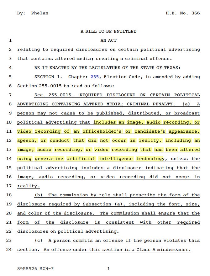 HB 366 aims to “require disclosure” whenever political advertising contains “altered media” with punishment being a Class A misdemeanor.