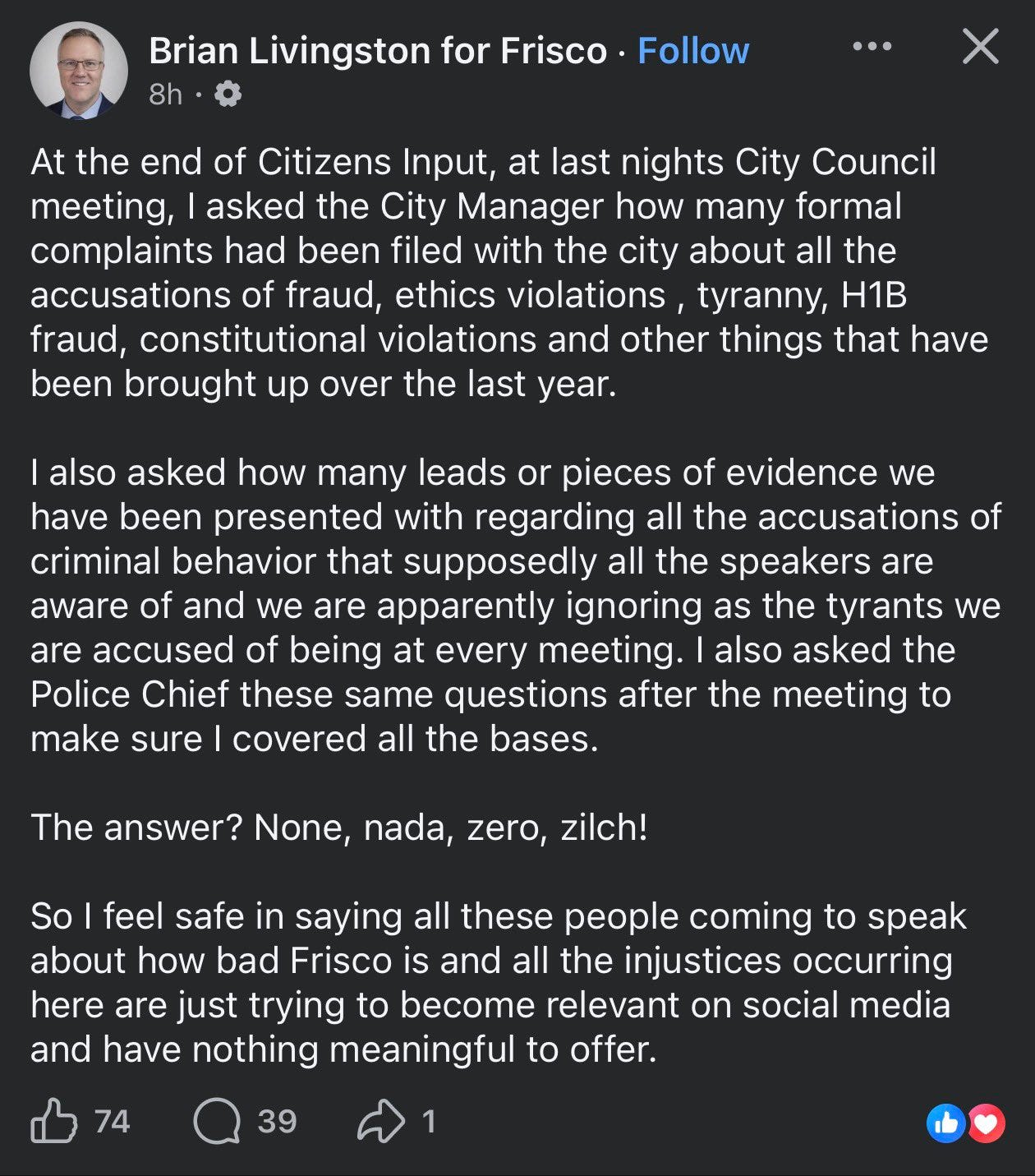 Frisco City Councilman, Brian Livingston, posted on Facebook yesterday that despite influencers accusing the city and council members of fraud, ethics violations, and other issues, nobody has actually filed complaints against them with the city or police.