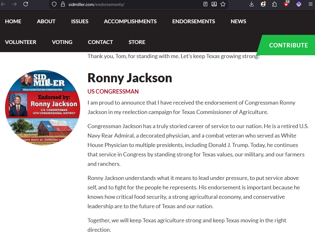 At the time of publishing, Miller still has Ronny Jackson listed as an endorsement on his website: