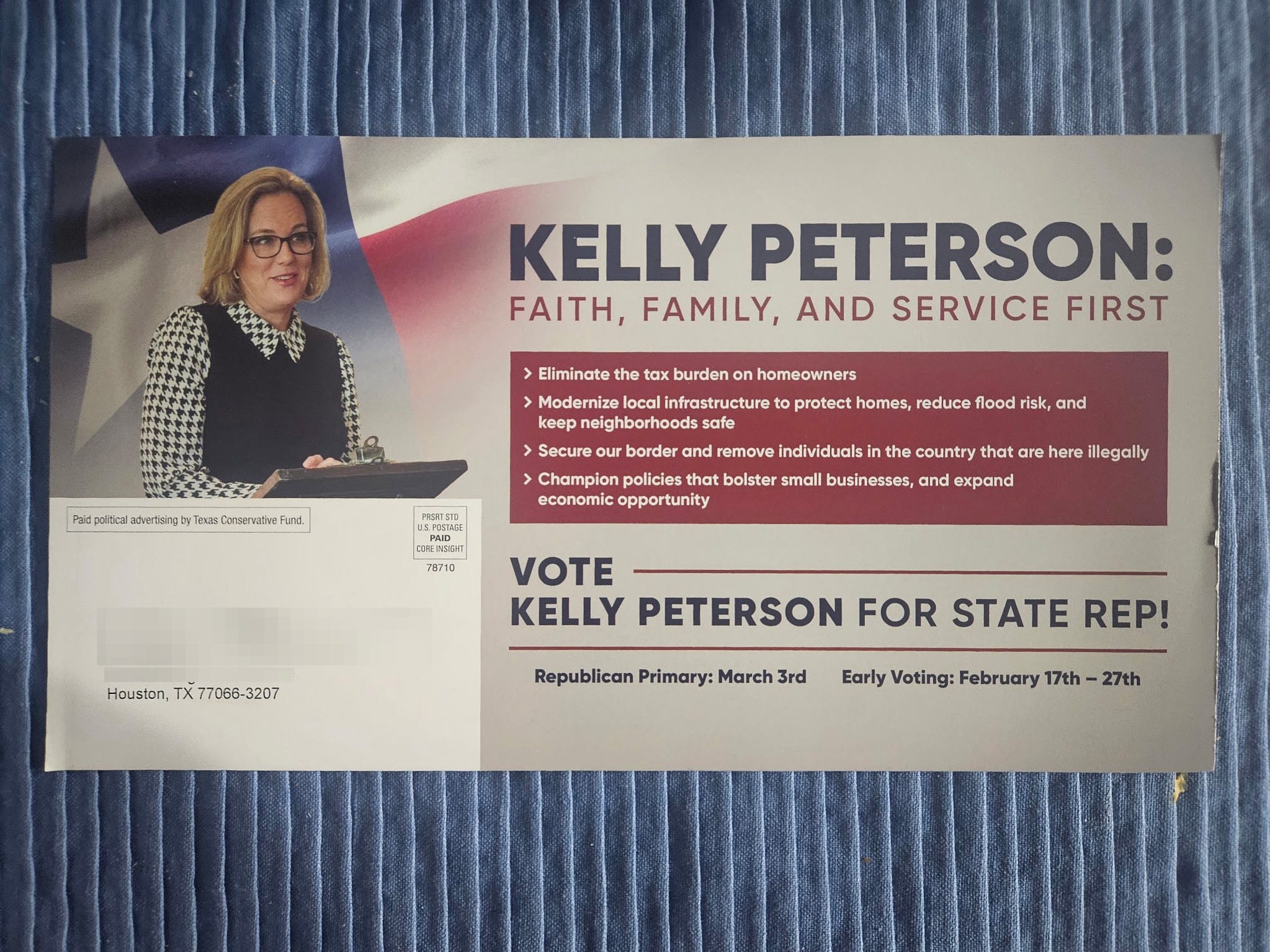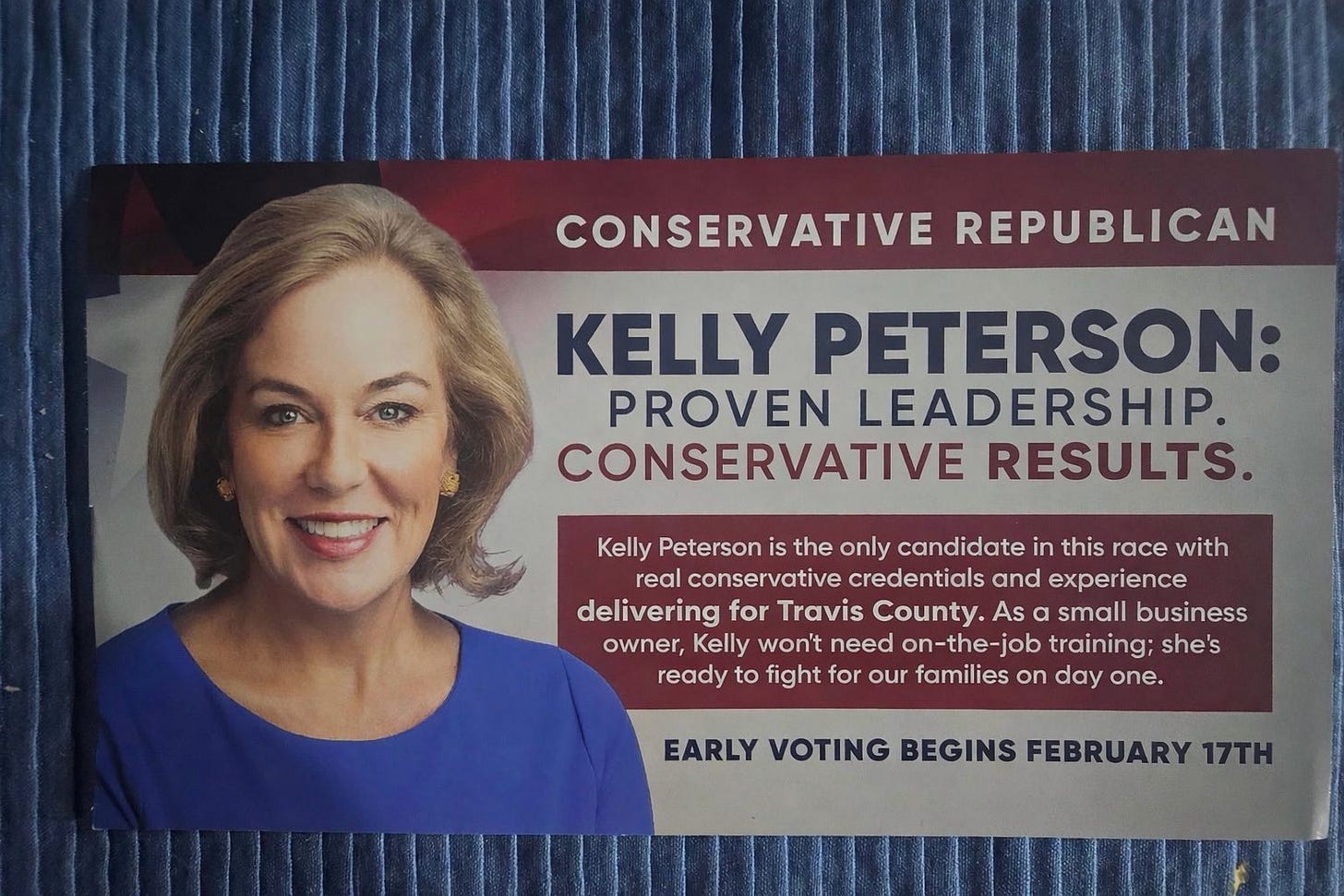 Republican candidate for HD126 Kelly Peterson recently sent out a mailer to Harris County constituents saying she would be the best choice for Travis County.