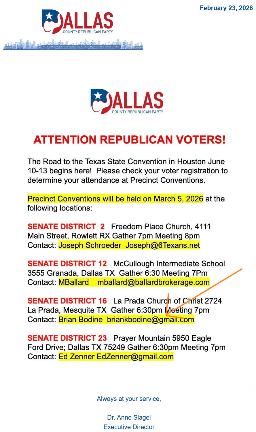 The Dallas County Republican Party sent out an email earlier this week listing Brian Bodine as the Senate District point of contact despite Bodine having cancelled his voter registration last year.
