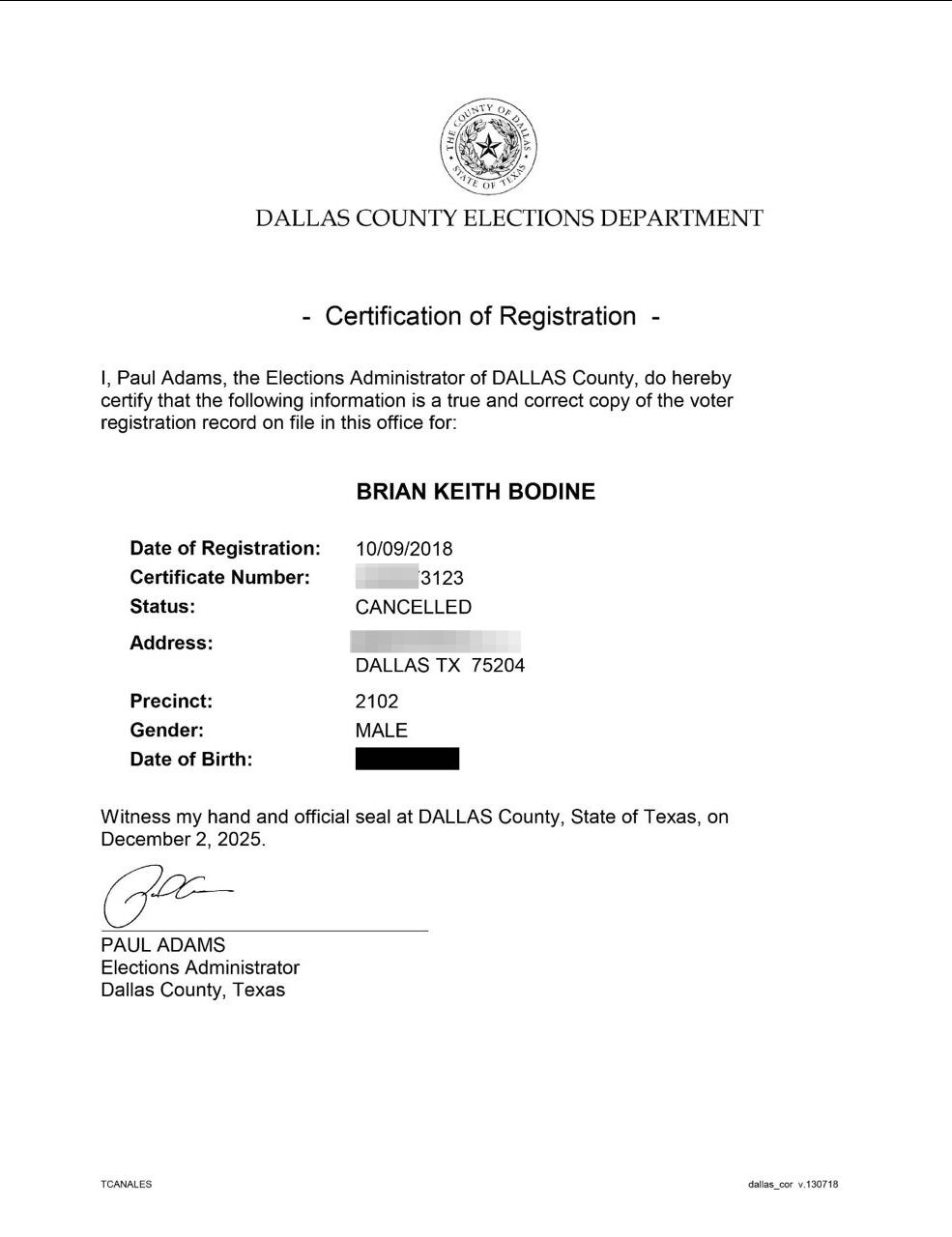 However, documents obtained by Current Revolt from the Dallas County Elections Department in December indicate that Bodine had cancelled his voter registration sometime last year.