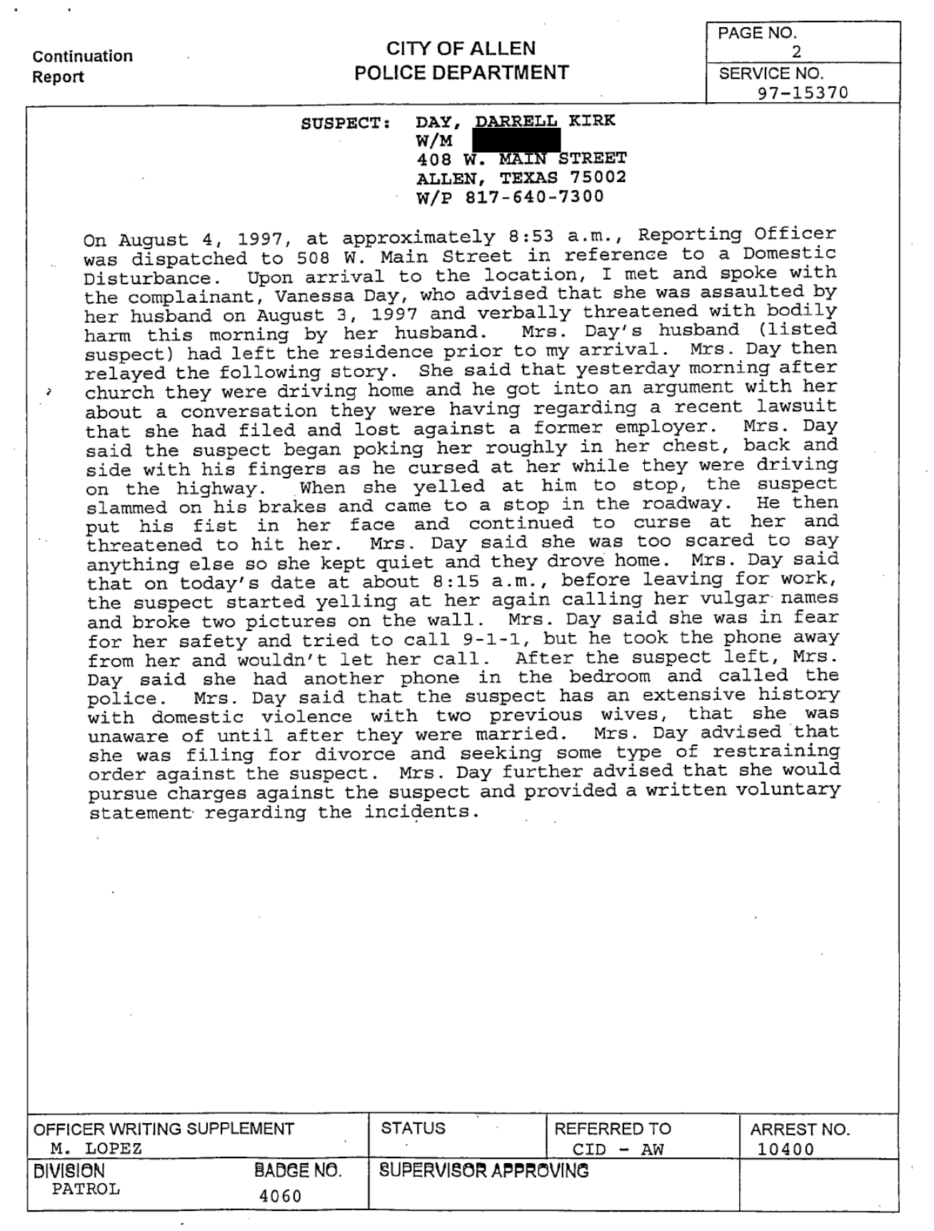 When reached out to Darrell Day for comment, he gave the following: “As someone happily married for 23 years, I pray that my ex-wife has finally found peace. Obviously, anyone can call the police for any bogus reason, and it’s pathetic that you would dredge up a call – quickly dropped by police – from more than 25 years ago.”