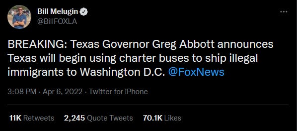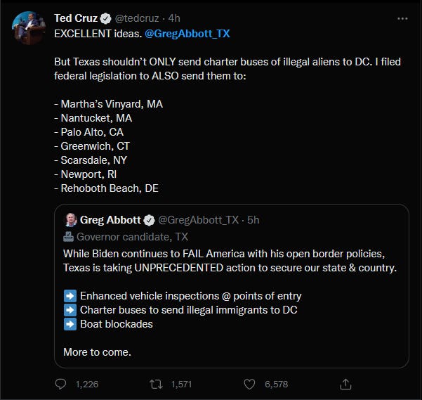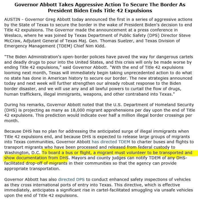 "To help local officials whose communities are being overwhelmed by hordes of illegal immigrants who are being dropped off by the Biden administration, Texas is providing charter buses to send these illegal immigrants who have been dropped off by the Biden administration to Washington D.C., We are sending them to the United States Capitol where the Biden administration will be able to more immediately address the needs of the people that they are allowing to come across our border."