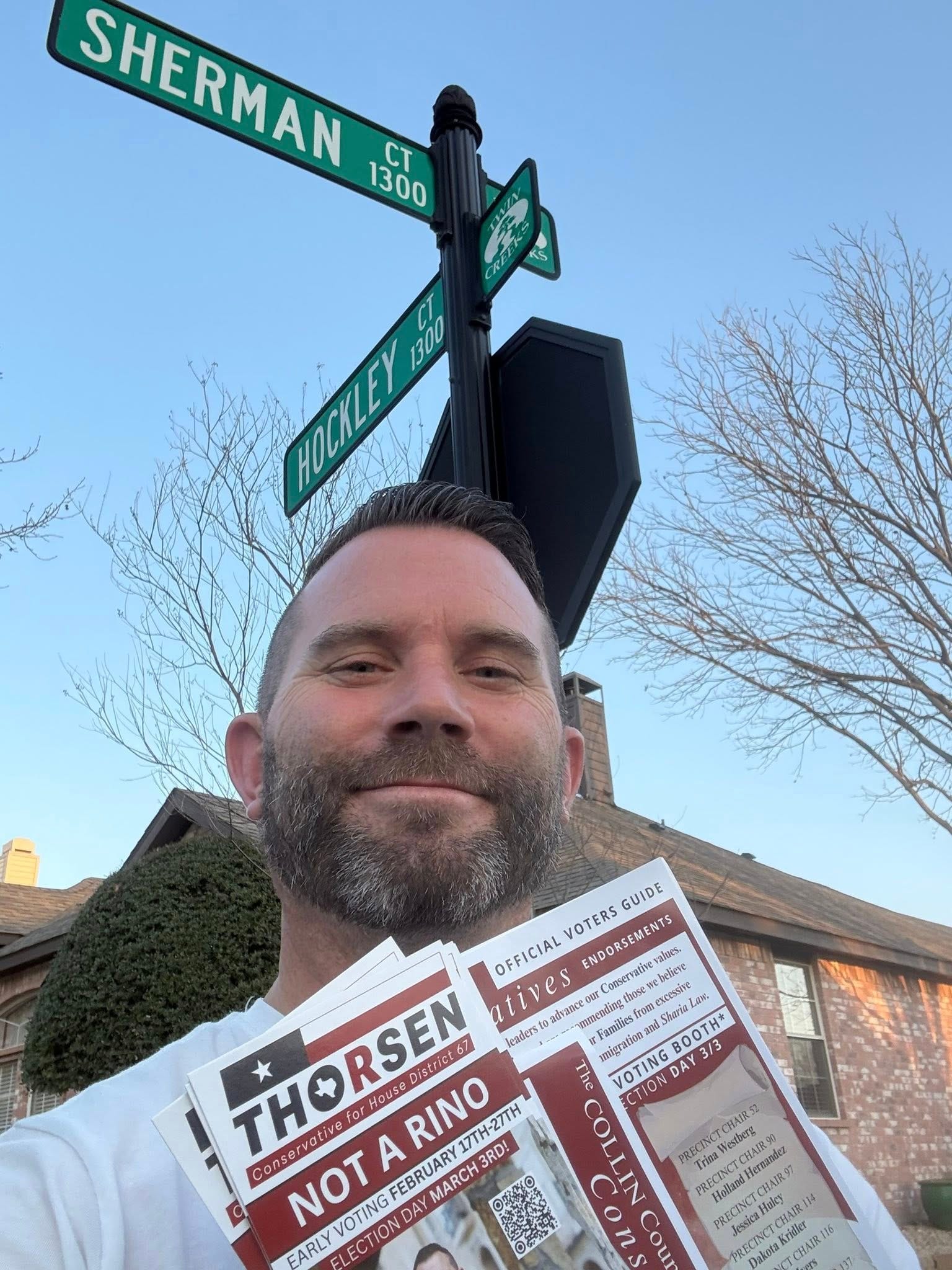 Matt Thorsen, who is challenging Rep. Jeff Leach for HD67, has a campaign slogan where he says he’s “NOT A RINO” which includes signs and flyers advertising this claim.