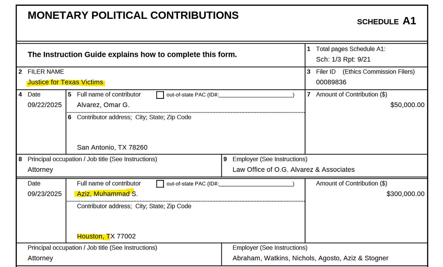 TEC records confirm Muhammad Aziz donating to the Justice for Texas Victims PAC: