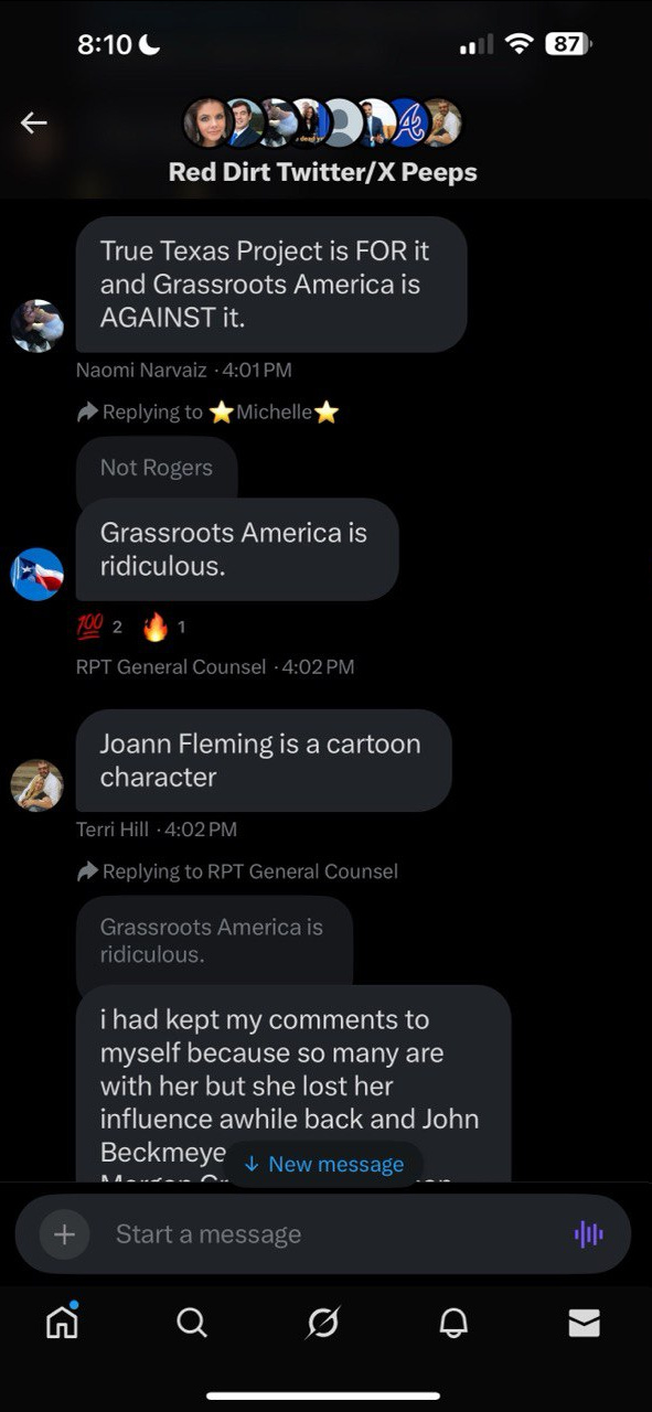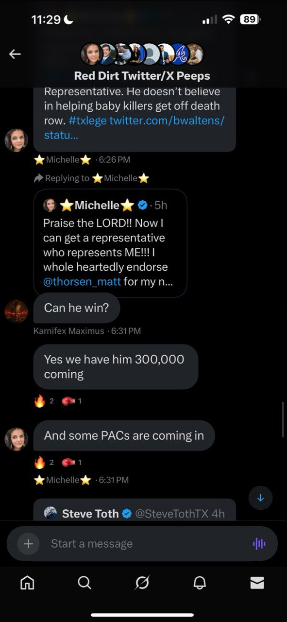 Leaked messages from the X group “Red Dirt Twitter/X Peeps” which includes Republican Party of Texas (RPT) Chairman Abraham George, RPT General Counsel Rachel Hooper, and Texas Attorney General Senior Advisor Michelle Smith show that the group was inquiring about Thorsen’s chances of defeating Leach. AG Senior Advisor Michelle Smith told the group “Yes we have 300,000 coming” and “…some PACs are coming in.”