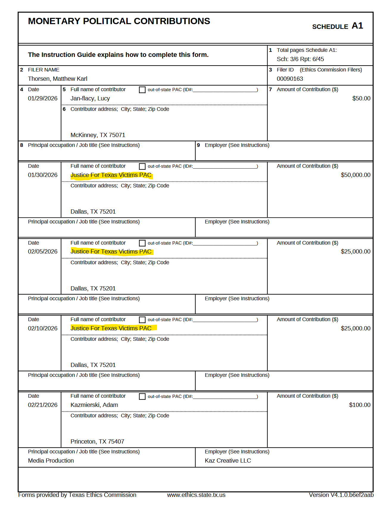 The donations from Justice for Texas Victims account for more than three-quarters of the funds raised by Thorsen during his campaign.