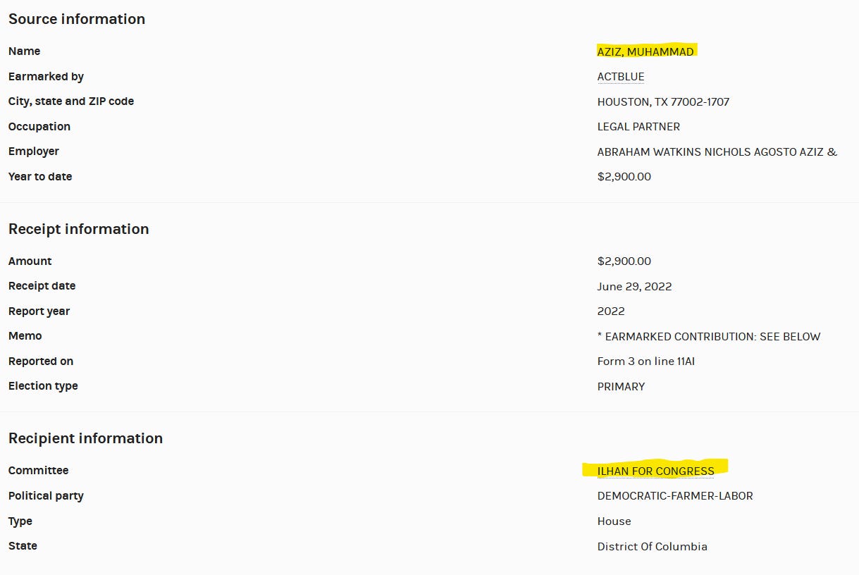 Additionally, FEC records confirm Muhammad Aziz’s donations to Ilhan Omar: