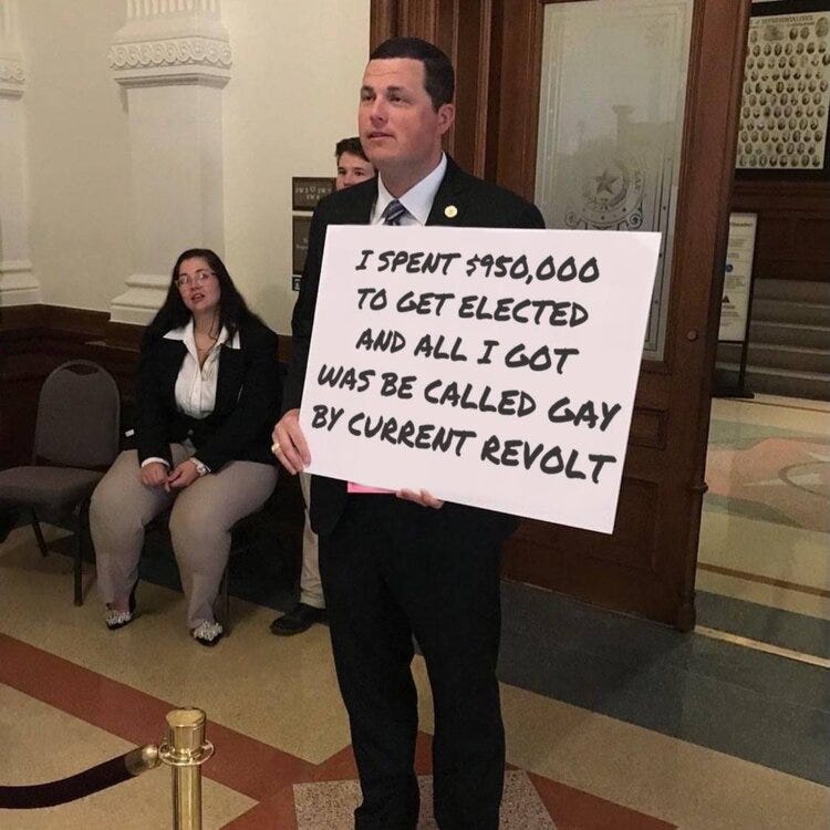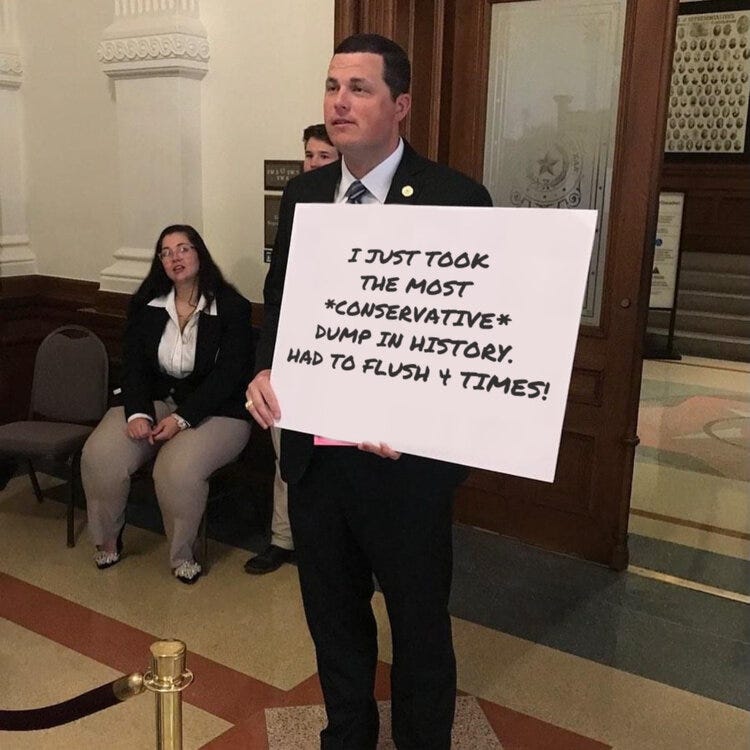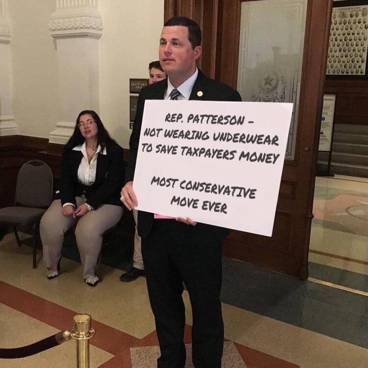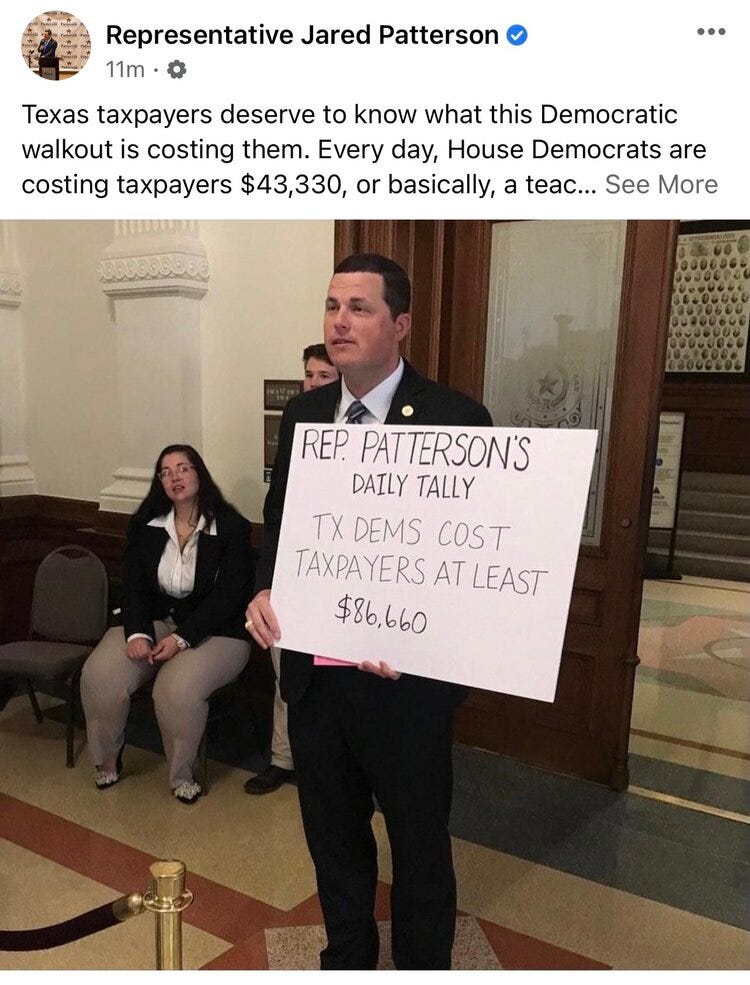 In his latest attempt to pretend he has a plan, Rep. Jared Patterson [Reptilian – Frisco] stood and held a handmade poster in the Texas Capitol building showing the amount of tax money wasted by Democrats in their insurrection of our elected government by fleeing to DC.