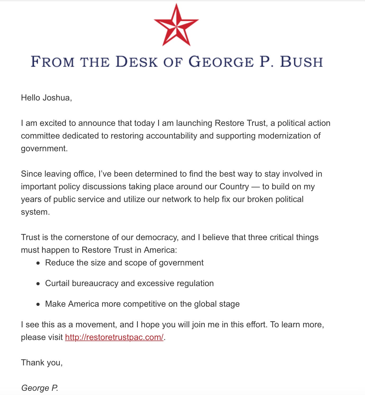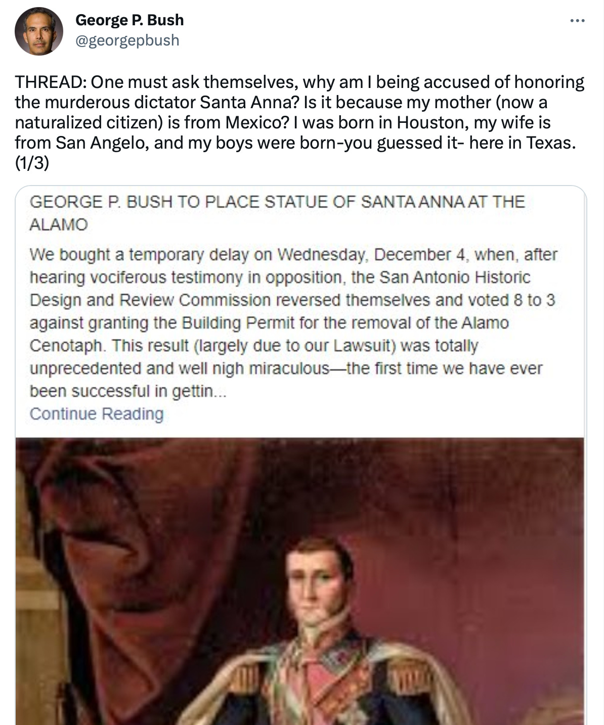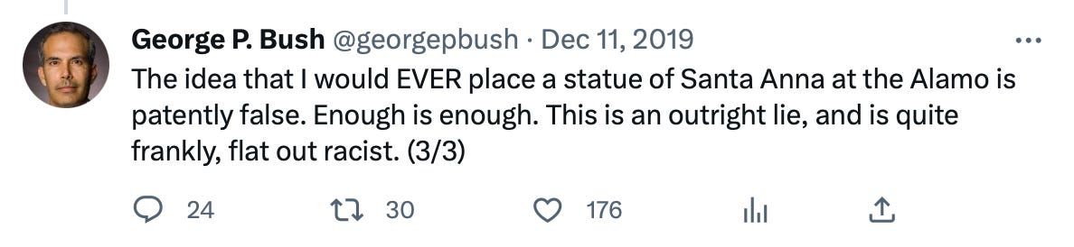 George P. needs to disappear from Texas politics. George fired the DRT from the Alamo, he tried to steal their library collection; we had to sue to get it back and it was settled in the Daughters' favor (wasted at least $100,000 on taxpayer money on this suit); George tried to relocate the Cenotaph; he wanted to Reimagine the Alamo; he refused to show up twice for his review of the GLO in front of the Texas Legislature; George ignored Texas law and the Republican Platform. He WASTED MILLIONS on his plan to reimagine the Alamo. Very few voted for him. He's done in politics. Give it up George!