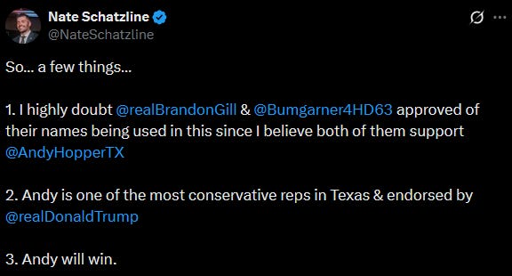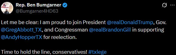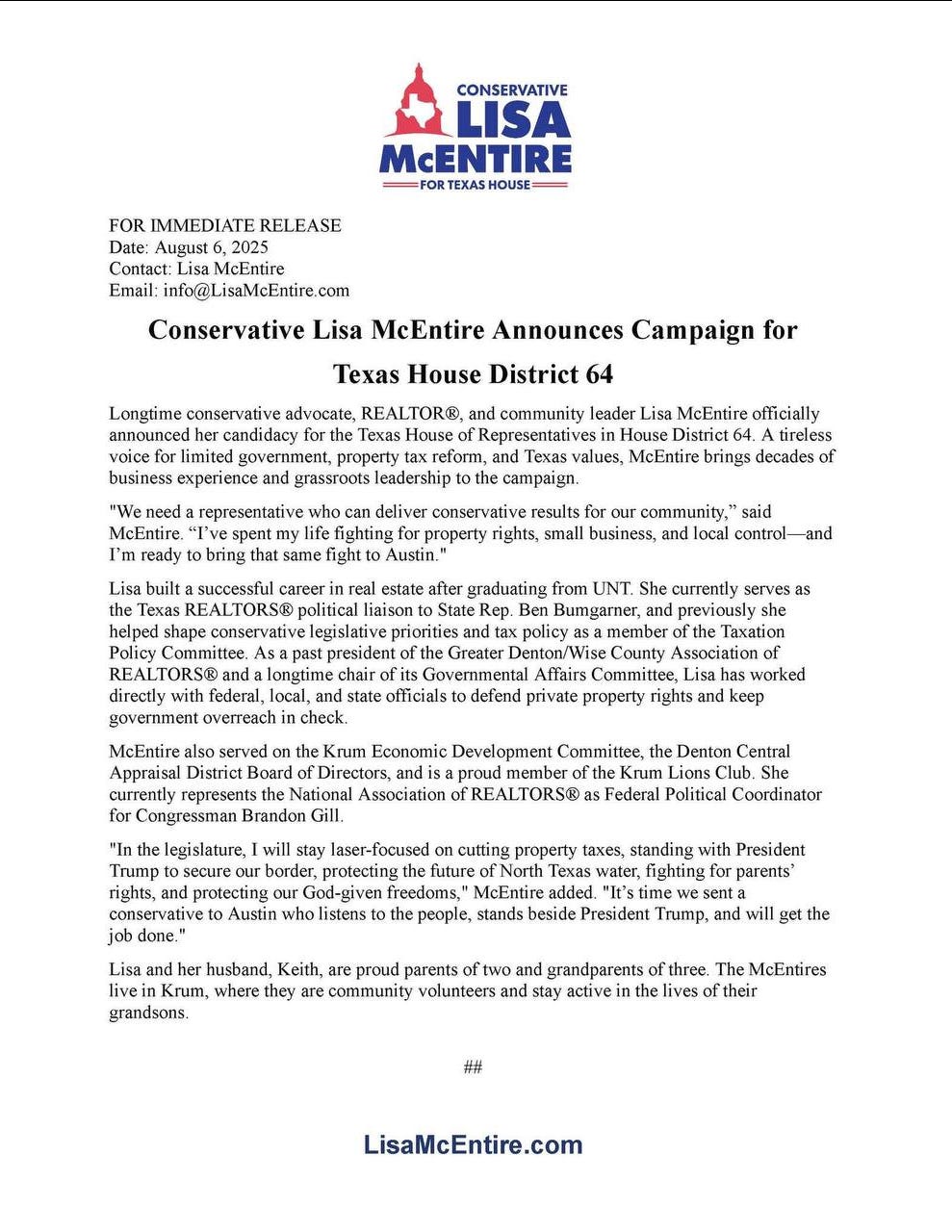 McEntire mentioned several Texas politicians including State Rep. Ben Bumgarner and Congressman Brandon Gill. Seemingly in an attempt to invoke authenticity and authority in her campaign announcement.