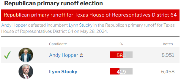 Representative Andy Hopper won his race against former incumbent Lynn Stucky by an overwhelming majority.