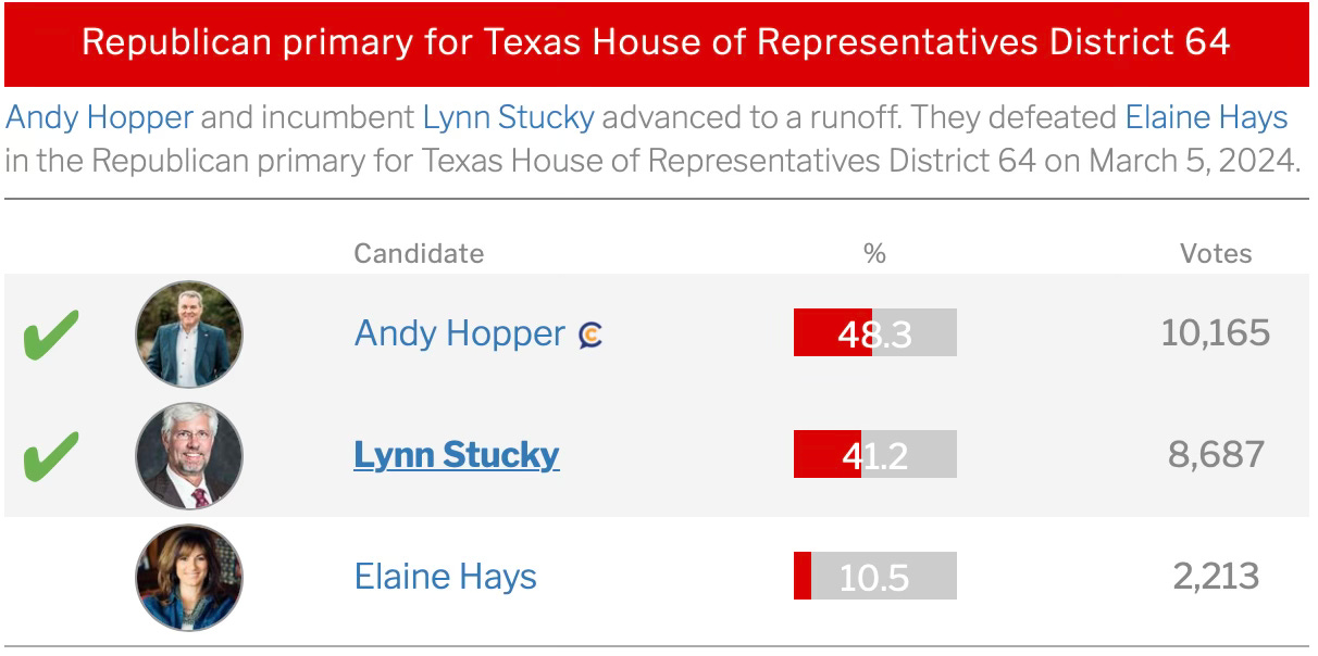 Today, Stucky is engaged in an intense runoff with Andy Hopper. Barely winning re-election in 2022, he faces an uphill battle to keep his seat. Adding to his problems, Stucky did not achieve even a plurality in the March 5th primaries.
