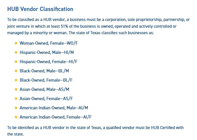 Vendors and contractors in Texas are invited to apply to be confirmed as “HUB certified” on the basis of race (except white) or being a woman. This signs them up for free business leads and special consideration (whether they are a qualified to deliver on a project with the State or not!) and all Texans (except for white men) can access this neat program to boost their business.