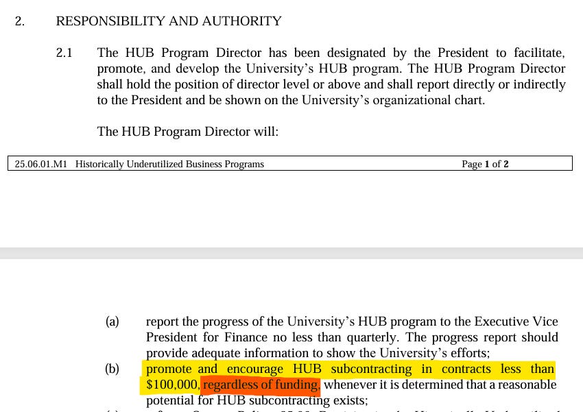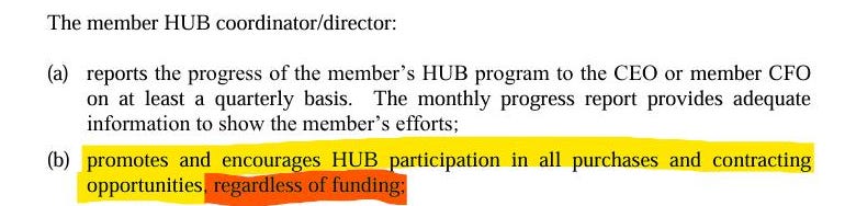There genuinely is no good reason for this program to exist, and it costs a lot of time and money to keep it up and running. Apparently coordinating it takes an army, and HUB leadership at Texas A&M alone is making well north of $100k a year to organize the shakedown, according to openthebooks.com.