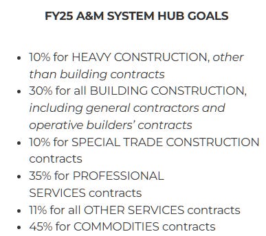 Take for instance the Texas A&M University System, one of many state organizations that participate in this scheme, in addition to organizations like TxDOT. Texas A&M actually has a quota system for how much money must be spent with these select DEI-approved companies, and explicitly states that decision makers should discriminate in their favor “regardless of funding” for all purchases.