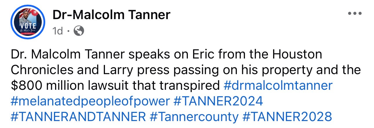 Tanner leads an organization called Melanated People of Power, which he has described as a movement seeking political and economic opportunity for those traditionally disenfranchised. He boasts a sizable social media presence — 244,000 Facebook followers and 70,000 on TikTok. His posts explained Loving County’s newcomers.