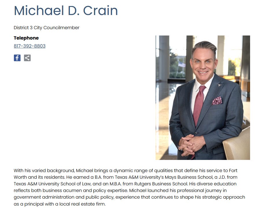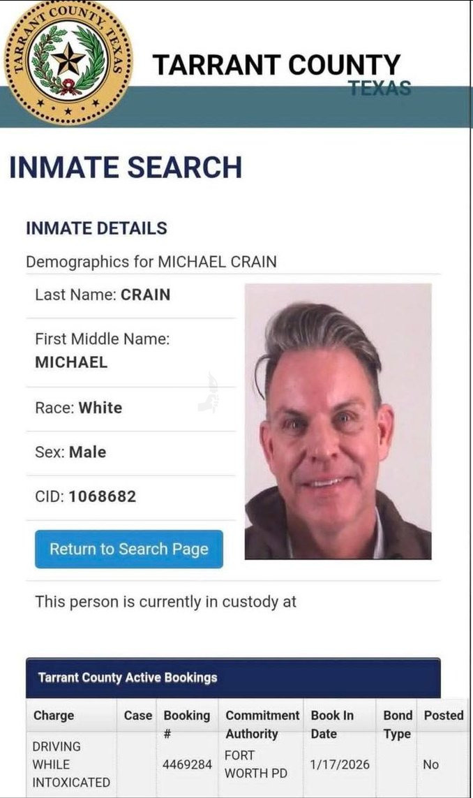 Michael D. Crain, City Council Member for Fort Worth, was arrested on driving while intoxicated charges this weekend (1/17/26).