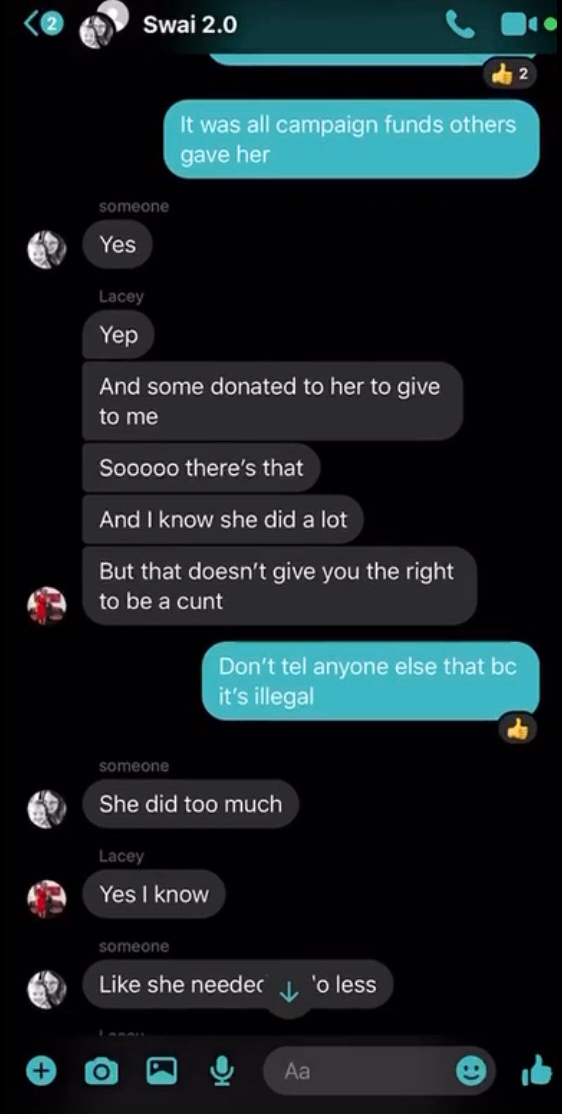 Detailed here are text messages that appear to hint at serious campaign finance violations in the form of funneling campaign contributions through Valoree Swanson that are meant for Hull. This is typically done to avoid names appearing on camapign finance reports.