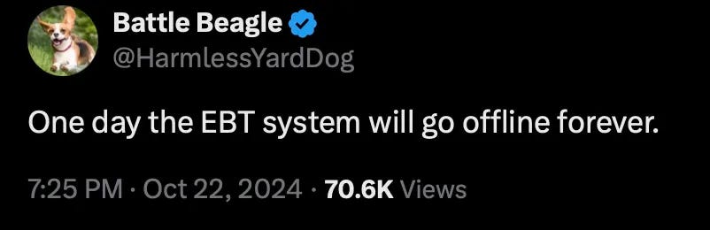 So far, there’s only one day left till the “EBTpocalypse,” when the US is set to run out of food stamp benefits for more than 40 million people, 3.5 million of whom are in Texas. Many of these beneficiaries aren’t happy about the benefits ending; some are even threatening insurrection. Many professionals with 6 kids and 8 baby daddies are even threatening to rob and murder people who work for a living.