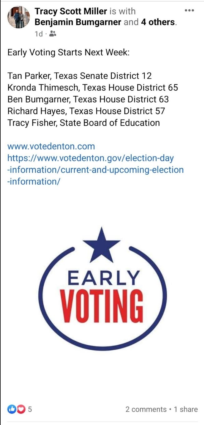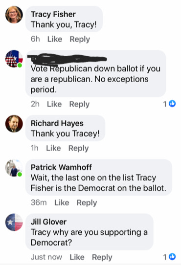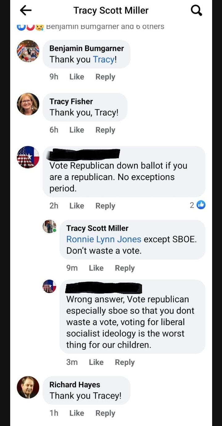 You thought the phenomenon of Republicans endorsing Democraps was relegated to Tarrant county? Think again. A few days ago, self-identified Republican Lewisville School Board (LISD) President Tracy Scott Miller openly endorsed Democrat State Board of Education (SBOE) nominee Tracy Fisher. His political apostasy was declared via his Facebook page, when he gave a recommendations list.