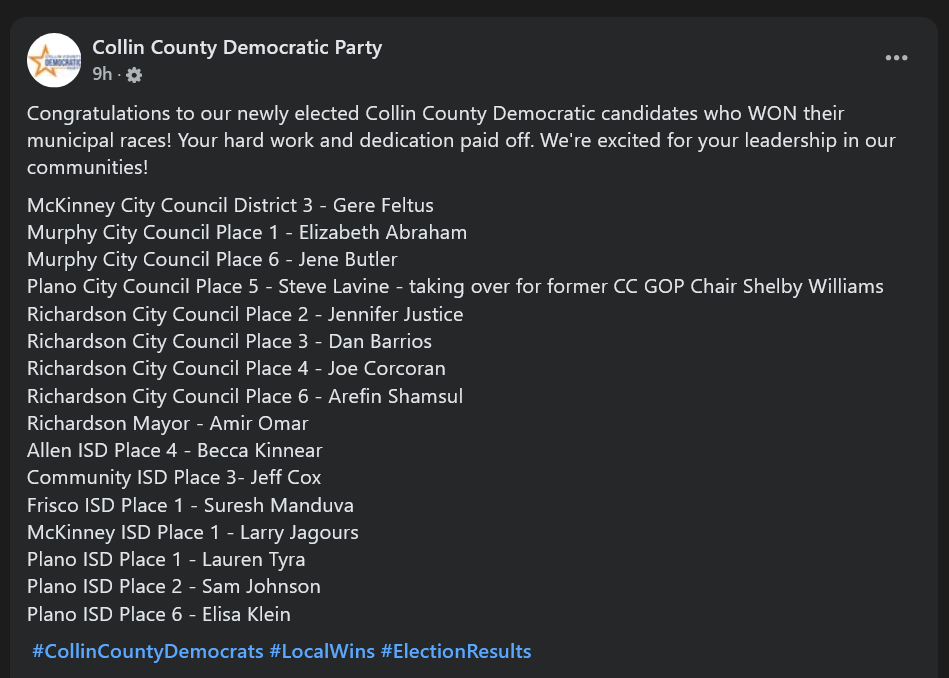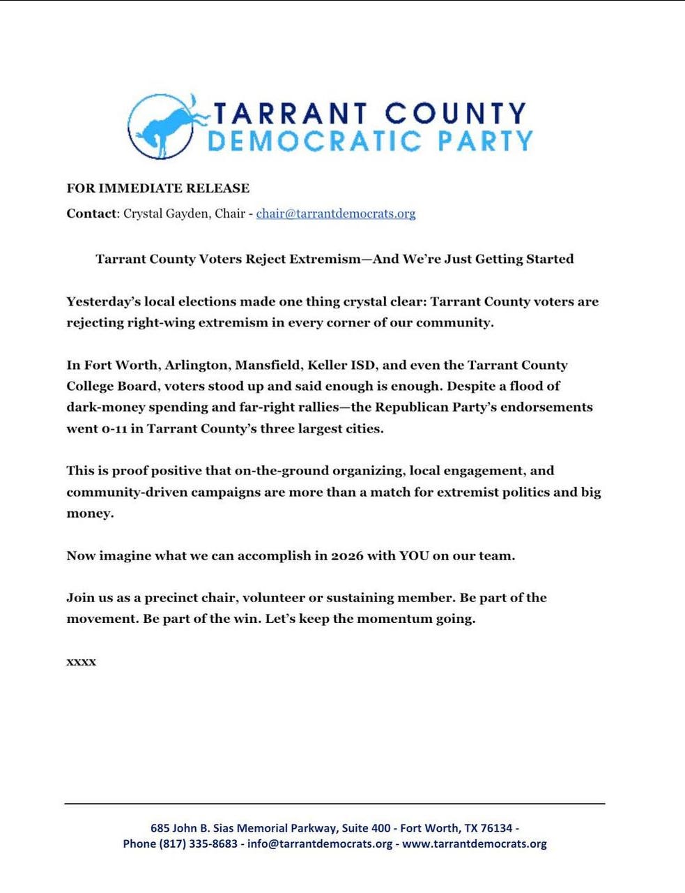 The Tarrant County Democratic Party did a victory lap claiming credit for the GOP losses.
