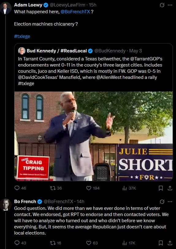Many people were asking why Tarrant County, the largest red county in America, performed so poorly. Tarrant County GOP Chair Bo French said that the losses were attributed to low turnout, and Republicans not caring about local elections.