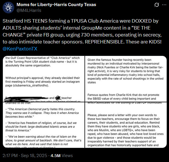 Last week, Moms for Liberty in Harris County posted screenshots of Nathalie Herpin listing the names and info of Spring Branch ISD (SBISD) students who were wanting to start a TPUSA chapter.