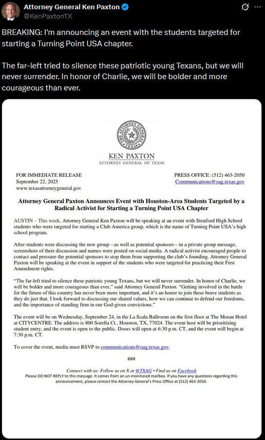 Yesterday, Attorney General Ken Paxton announced an event he would be hosting with students who were targeted by Herpin.