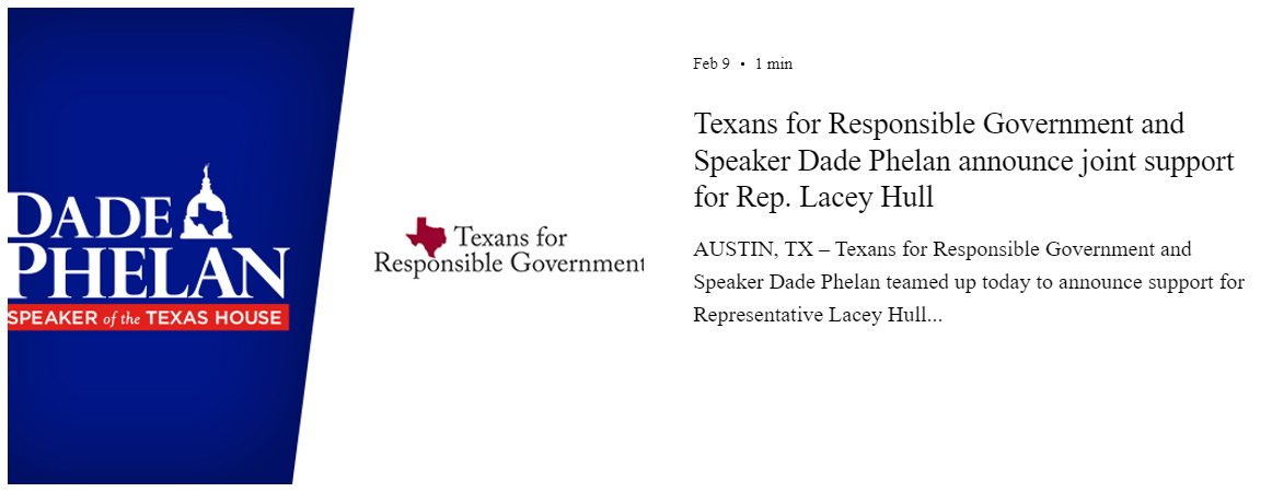 Texans For Responsible Government PAC itself works closely with allies of Dade Phelan and other establishment Republicans. Here you can see Phelan and TRG PAC endorsing Lacey Hull of corndog fame.