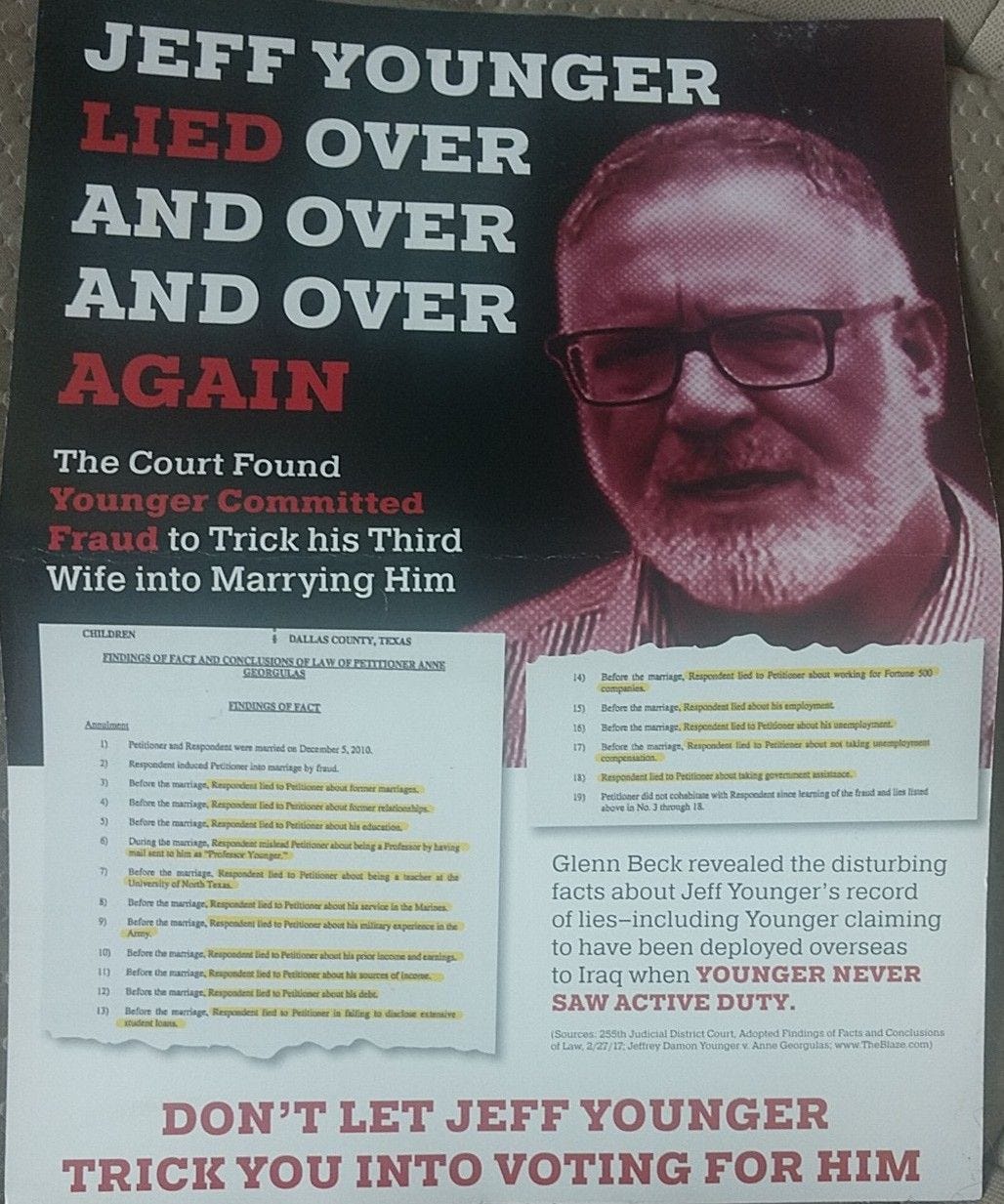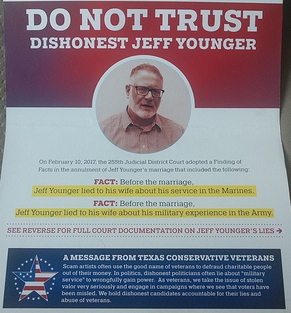 Nathan Kaspar, the founder and main figure behind Texas Conservative Veterans PAC, when asked for comment characterized Jeff as having perpetrated stolen valor. His view is that Jeff’s short term of service is the same as not having served in his mind. As you can see, the attacks on the flyer mention details of Jeff’s divorce from the woman who is actively attempting to castrate his son and shies away from directly stating it.
