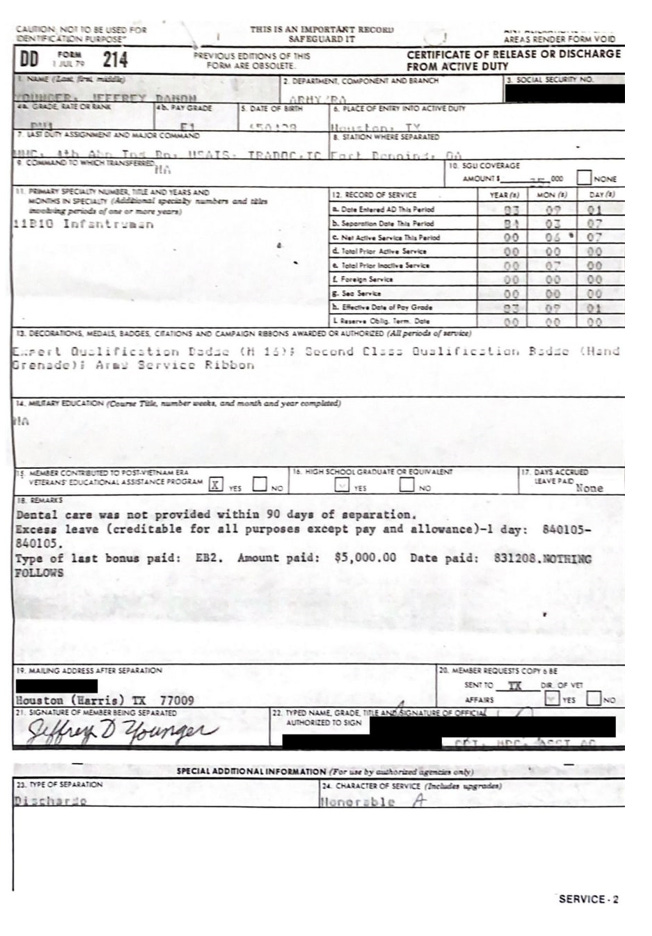 Younger, when reached for comment, said “I was honorably discharged from the US Army in 1984. My last post was Headquarters United States Army Airborne School. Prior to that, I served in the USMC. In both cases, I was an infantryman.” Younger also provided us a copy of his DD-214